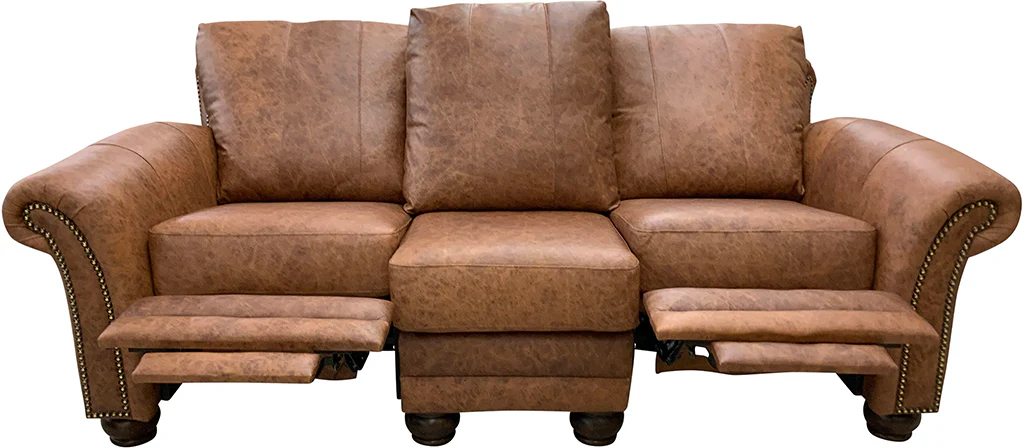 Modern contemporary style accented by a cured arm and nail heads. Comes standard with nail heads on the bottom front rail, wings or ears, and the 2 front arm posts.